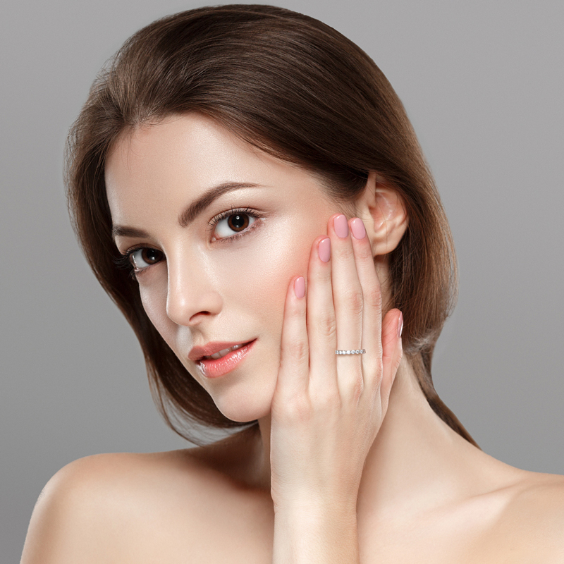 טבעת איטרניטי מלאה, משובצת בשורה רציפה של אבני מואסנייט עגולות בקוטר 3 מ”מ, בשיבוץ קלאסי היוצר ניצוץ עדין ועל־זמני. הטבעת מגיעה עם תעודה בינלאומית.