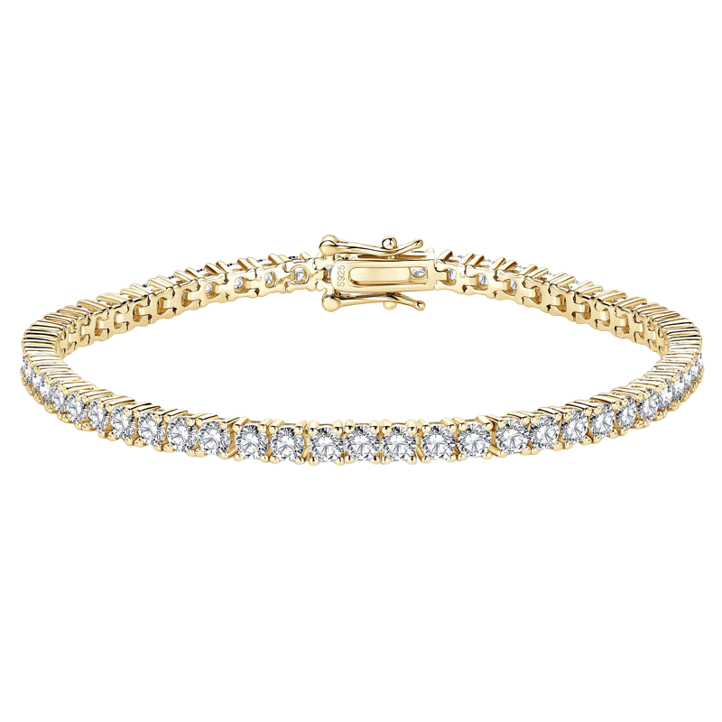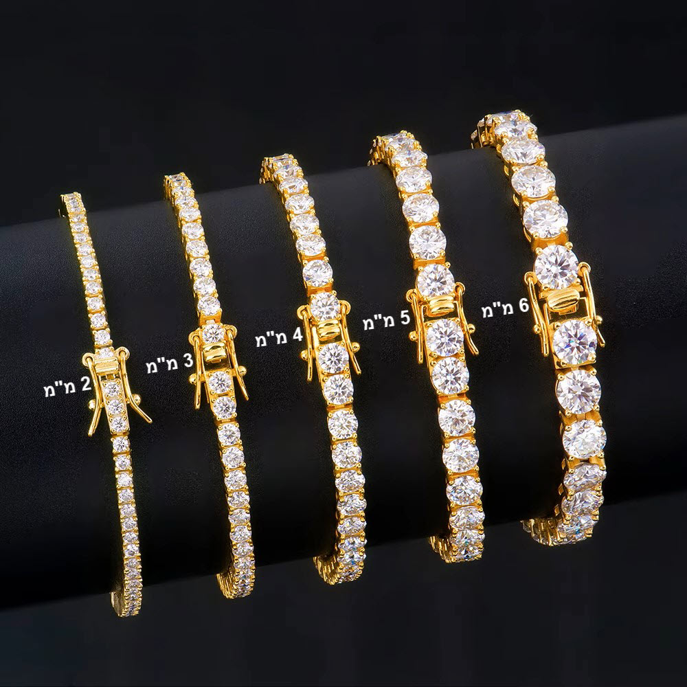 צמיד טניס עשוי כסף טהור 925 בציפוי זהב 18K איכותי בעובי של 7 שכבות לעמידות גבוהה לאורך זמן. משובץ לכל אורכו באבני מוסנייט עגולות בקוטר 3 מ”מ, באיכות VVS גבוהה, לניצוץ בולט ועוצמתי בסגנון ייחודי. הצמיד כולל סגירה בטוחה, עיצוב דומיננטי ונוכחות מרשימה על היד. מגיע עם תעודה בינלאומית. מושלם למי שמחפש לשלב יוקרה, סטייל ואמירה בלתי מתפשרת.