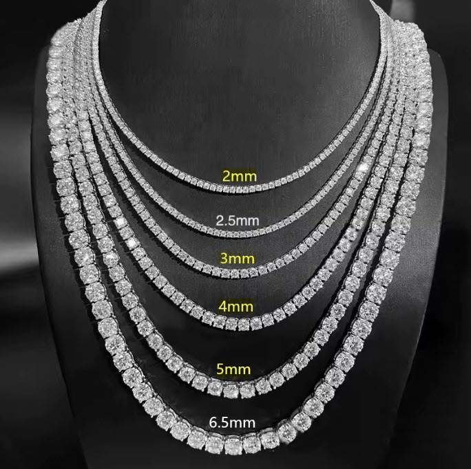 שרשרת טניס יוקרתית משובצת במואסנייט איכותי. השרשרת עשויה כסף סטרלינג 925 ומשובצת באבני מואסנייט VVS נוצצות בקטרים לבחירה – 2 מ”מ, 3 מ”מ 4 מ”מ או 5 מ”מ – המעניקות מראה עשיר ונוצץ בעוצמה יהלומית. העיצוב הקלאסי בשיבוץ צפוף יוצר ברק רציף ומרשים, מתאים לנשים ולגברים המחפשים נוכחות אלגנטית ובולטת. מגיעה עם תעודה בינלאומית ואפשרות לבחירת אורך והתאמה אישית.