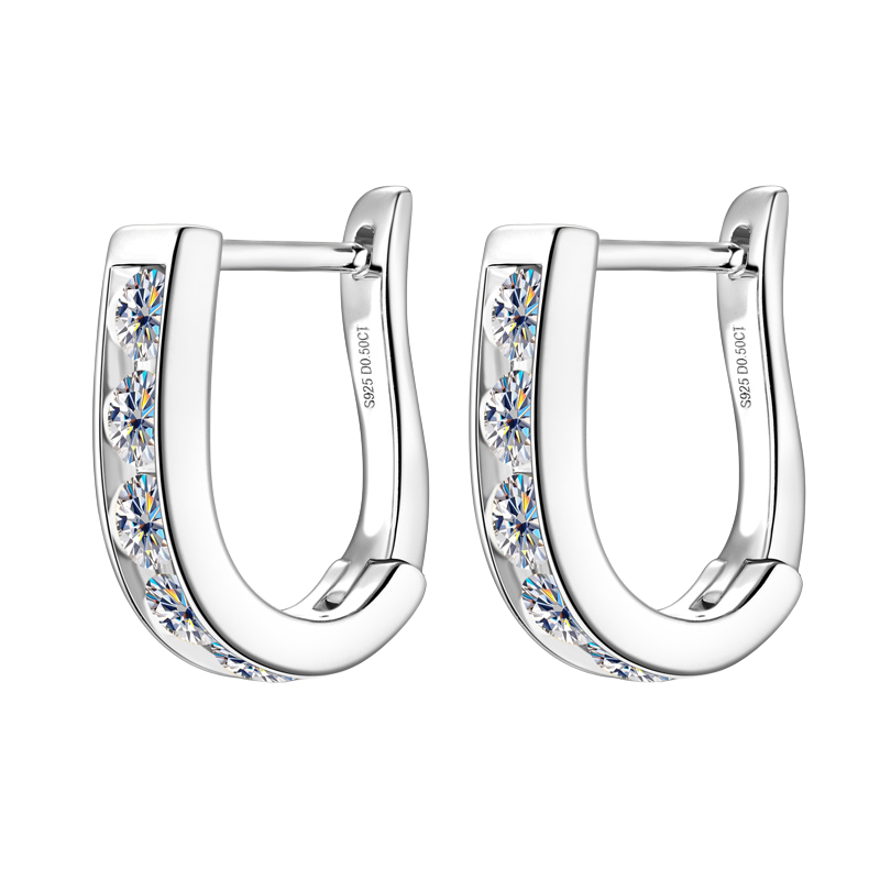עגילי U קלאסיים בעיצוב אלגנטי ונקי. העגילים משובצים בחמש אבני מואסנייט נוצצות, היוצרות קשת של ברק מרשים וניצוץ רך מכל זווית. עיצוב ה־U מעניק מראה מודרני ומדויק, מושלם ליום־יום וגם לאירועים.