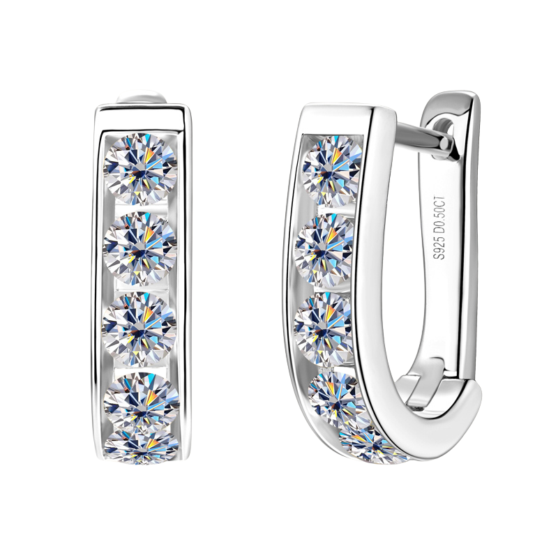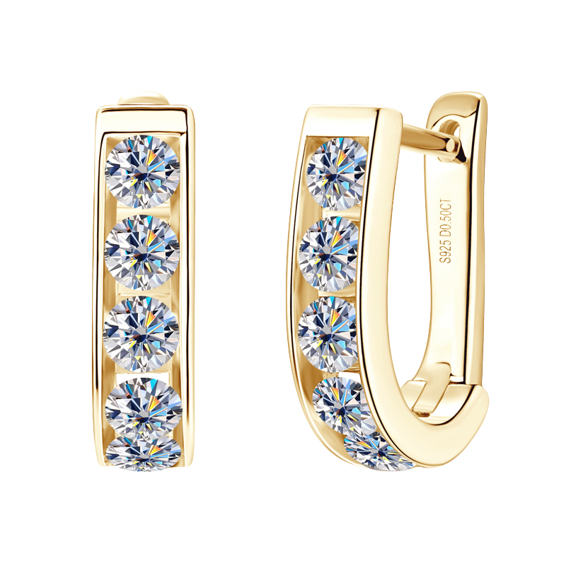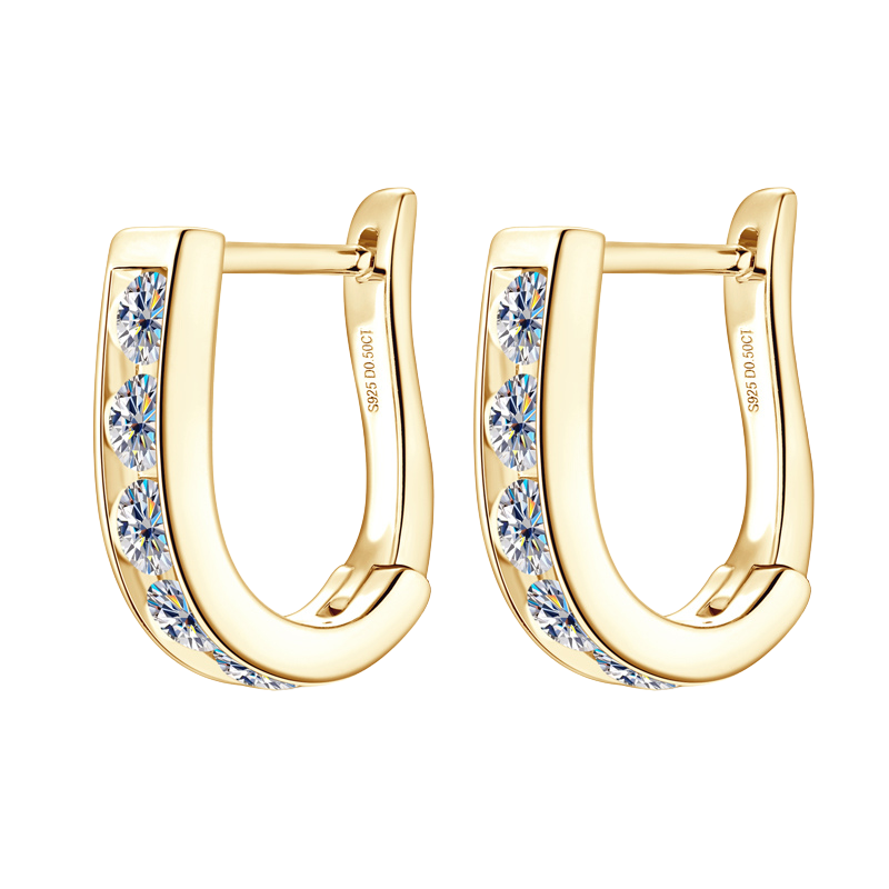 עגילי U קלאסיים בעיצוב אלגנטי ונקי. העגילים משובצים בחמש אבני מואסנייט נוצצות, היוצרות קשת של ברק מרשים וניצוץ רך מכל זווית. עיצוב ה־U מעניק מראה מודרני ומדויק, מושלם ליום־יום וגם לאירועים.