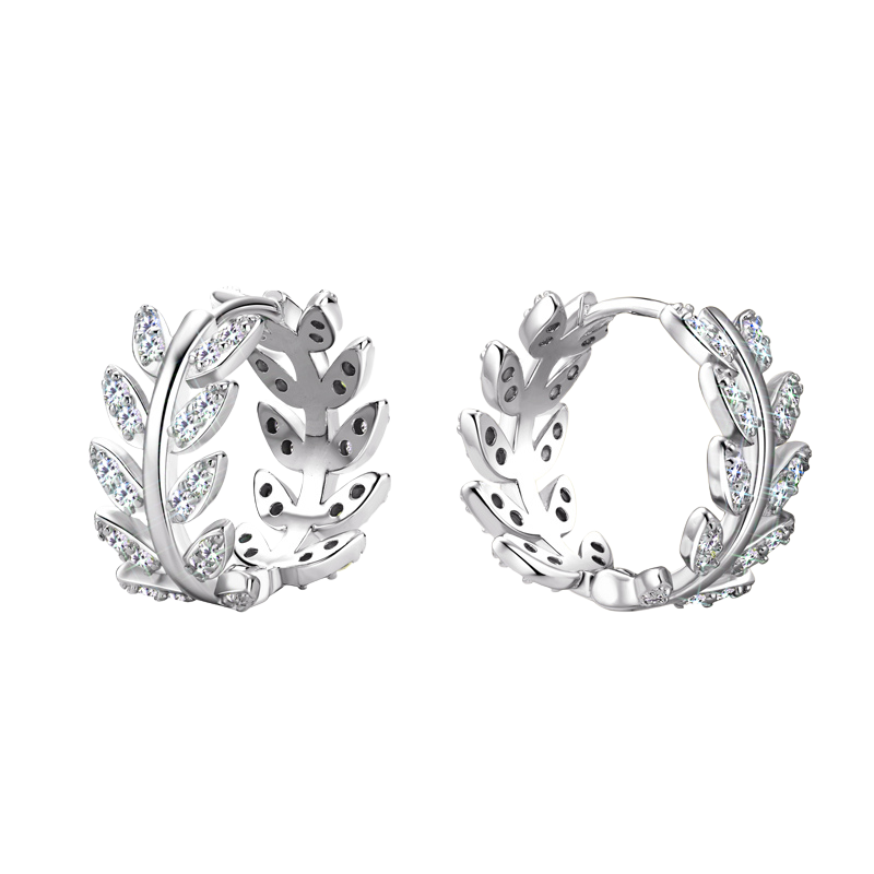 עגילי עלים עדינים, בעיצוב טבעי המשדר רוך ואלגנטיות. העגילים משובצים באבני מואסנייט קטנות ונוצצות.