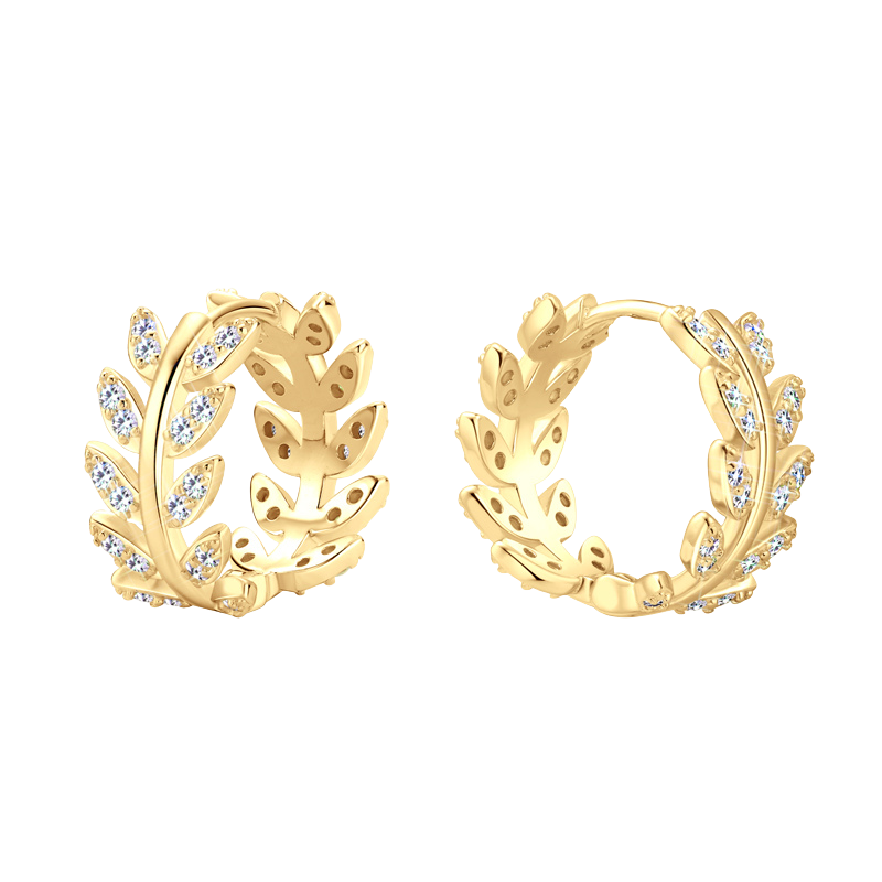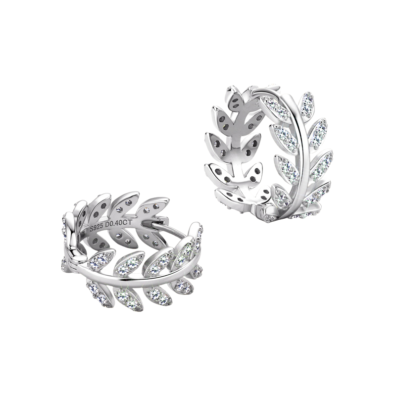 עגילי עלים עדינים, בעיצוב טבעי המשדר רוך ואלגנטיות. העגילים משובצים באבני מואסנייט קטנות ונוצצות.
