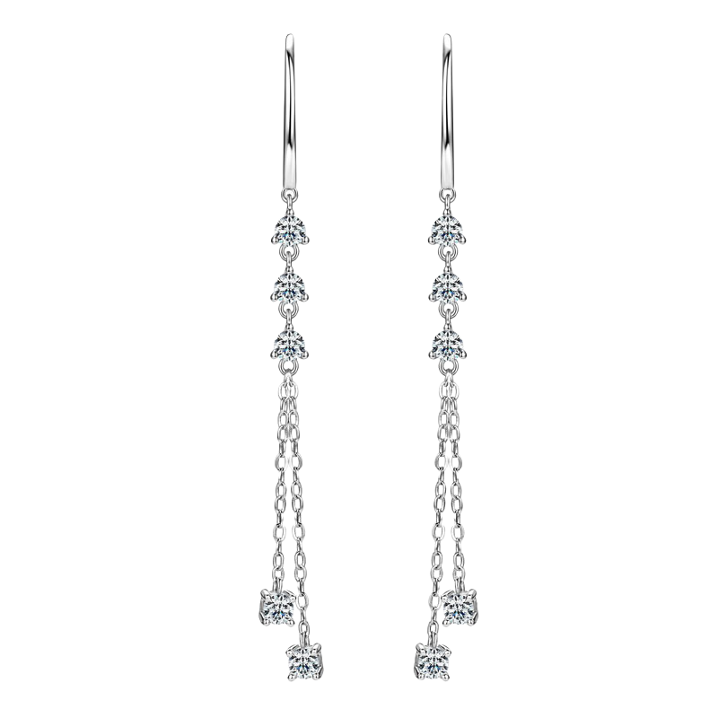 עגילי תלייה בעיצוב עדין ונשי ומשובצים בעשר אבני מואסנייט עגולות באיכות גבוהה, המפזרות ברק עדין וניצוץ מרהיב בתנועה. שילוב השרשראות הדקות והאבנים התלויות יוצר מראה אלגנטי, קליל וזוהר – מושלם לערב או לאירועים מיוחדים. העגילים מגיעים עם תעודה בינלאומית.