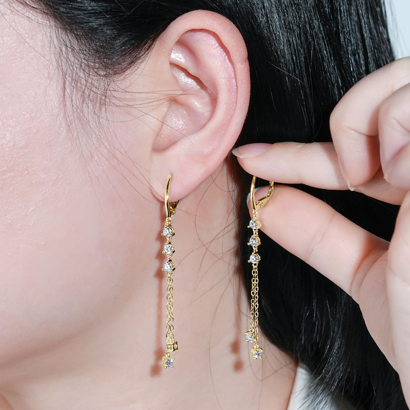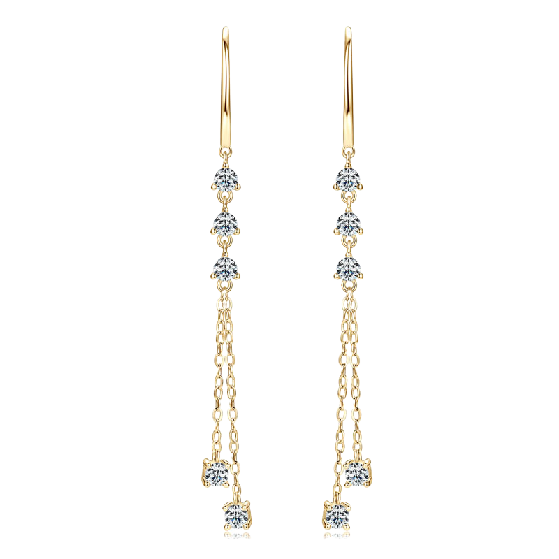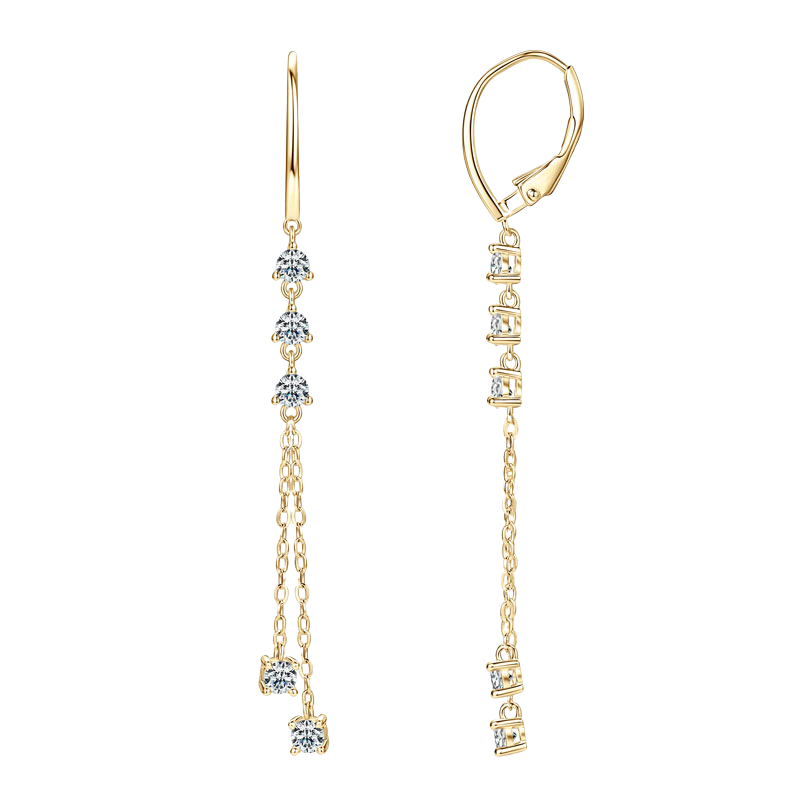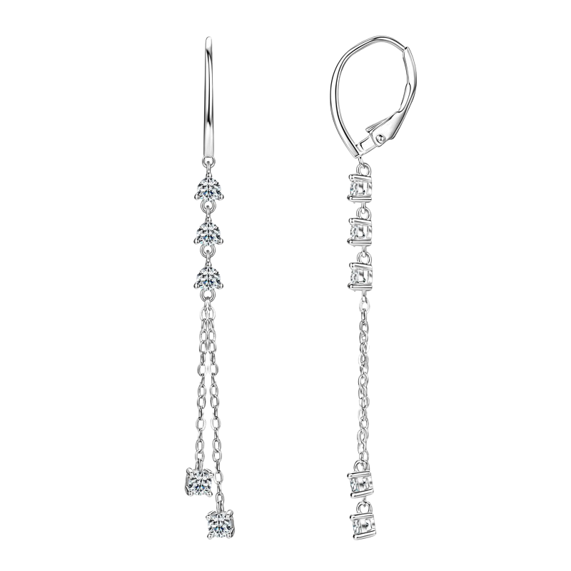 עגילי תלייה בעיצוב עדין ונשי ומשובצים בעשר אבני מואסנייט עגולות באיכות גבוהה, המפזרות ברק עדין וניצוץ מרהיב בתנועה. שילוב השרשראות הדקות והאבנים התלויות יוצר מראה אלגנטי, קליל וזוהר – מושלם לערב או לאירועים מיוחדים. העגילים מגיעים עם תעודה בינלאומית.