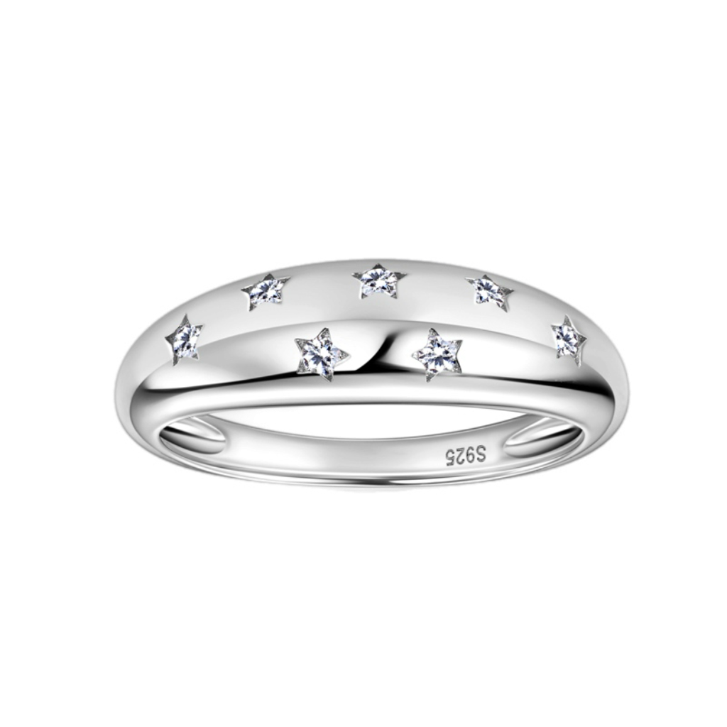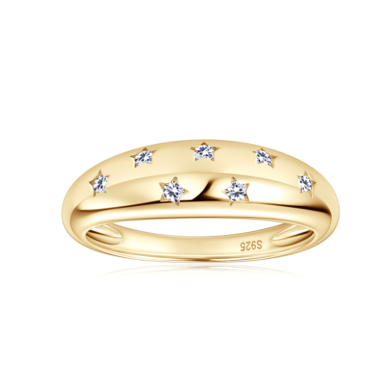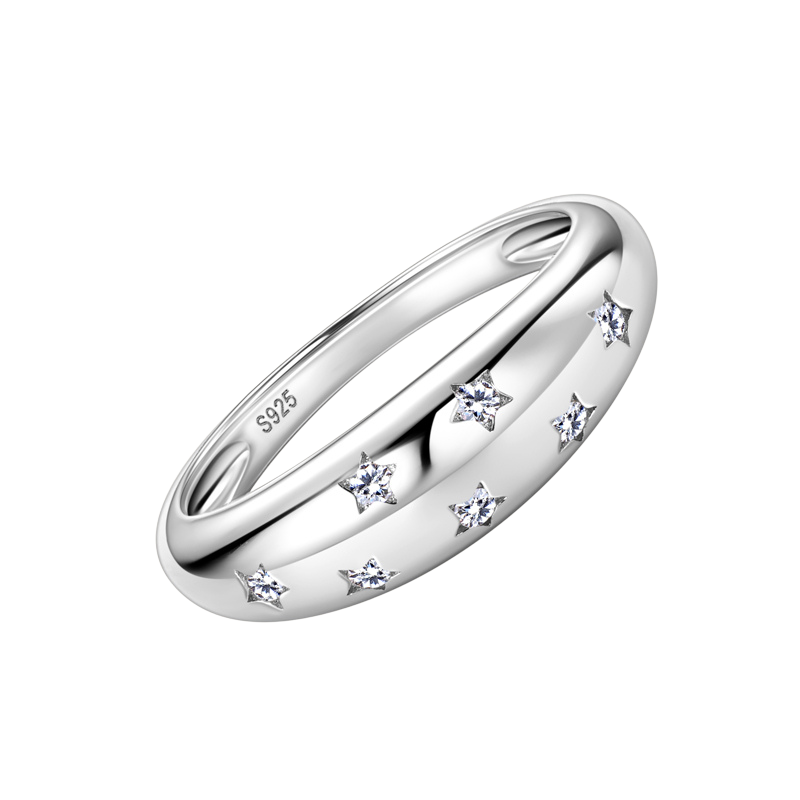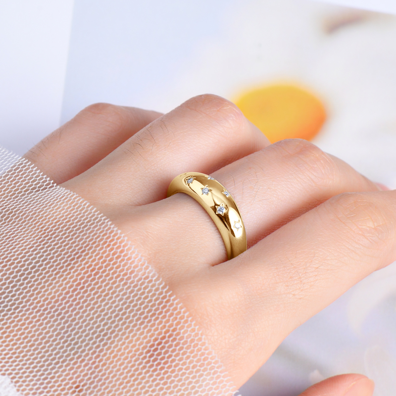 טבעת נישואין קלאסית מעוטרת בכוכבים שבכל כוכב משובצת אבן נוצצת תחושה של התבוננות בשמים זרועי כוכבים, הטבעת מגיעה עם תעודת בינלאומית.